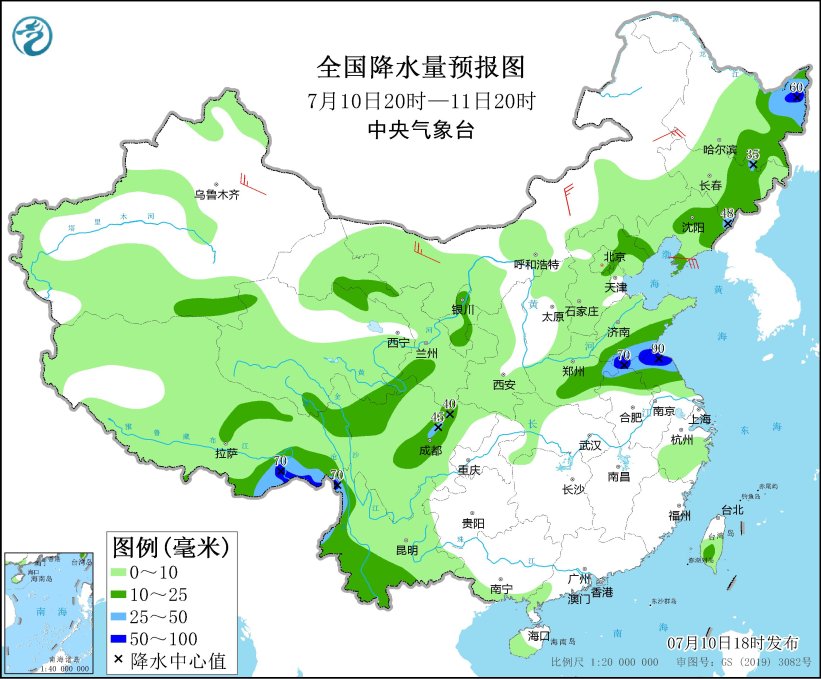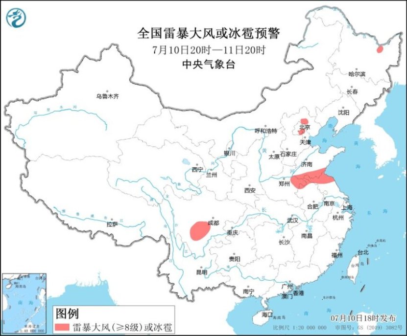 预计7月10日20时至11日20时,黑龙江东北部、河北北部、北京东南部、天津北部、山东南部、河南东部、安徽北部、江苏北部、川西高原南部和四川盆地西南部等地的部分地区将有8~10级雷暴大风或冰雹天气(见图2);黑龙江东部、吉林东部、辽宁、陕西东南部、河北中北部、北京东部、天津北部、山东西北部和南部、河南东部和西南部、安徽北部、江苏中北部、川西高原、四川盆地西部、云南中南部等地的部分地区将有短时强降水天气,小时雨量30-50毫米,局地可达60毫米以上。预计,强对流的主要影响时段为今天夜间和明天午后。中央气象台7月10日18时继续发布强对流天气蓝色预警。