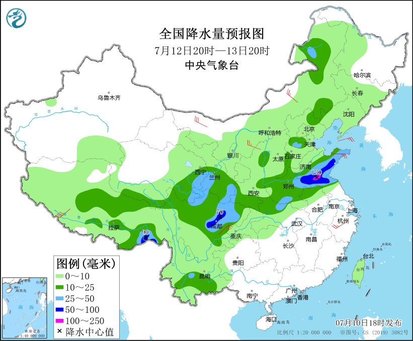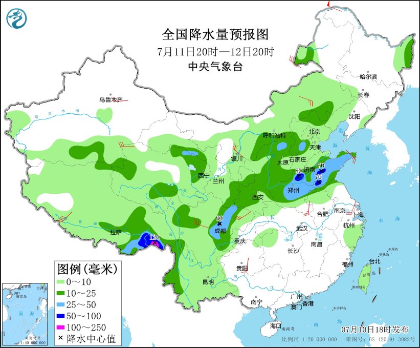 7月11日至14日,四川盆地、西北地区东部、华北、黄淮、东北地区等地将出现较强降雨过程,其中,四川盆地、甘肃南部、陕西南部、河南、山东、苏皖北部以及吉林、黑龙江南部、内蒙古东北部、西藏东南部等地的部分地区有大到暴雨,四川盆地、山东中南部、江苏北部及西藏东南部等地部分地区有大暴雨;降雨过程伴有雷电、短时强降水和局地雷暴大风等强对流天气。